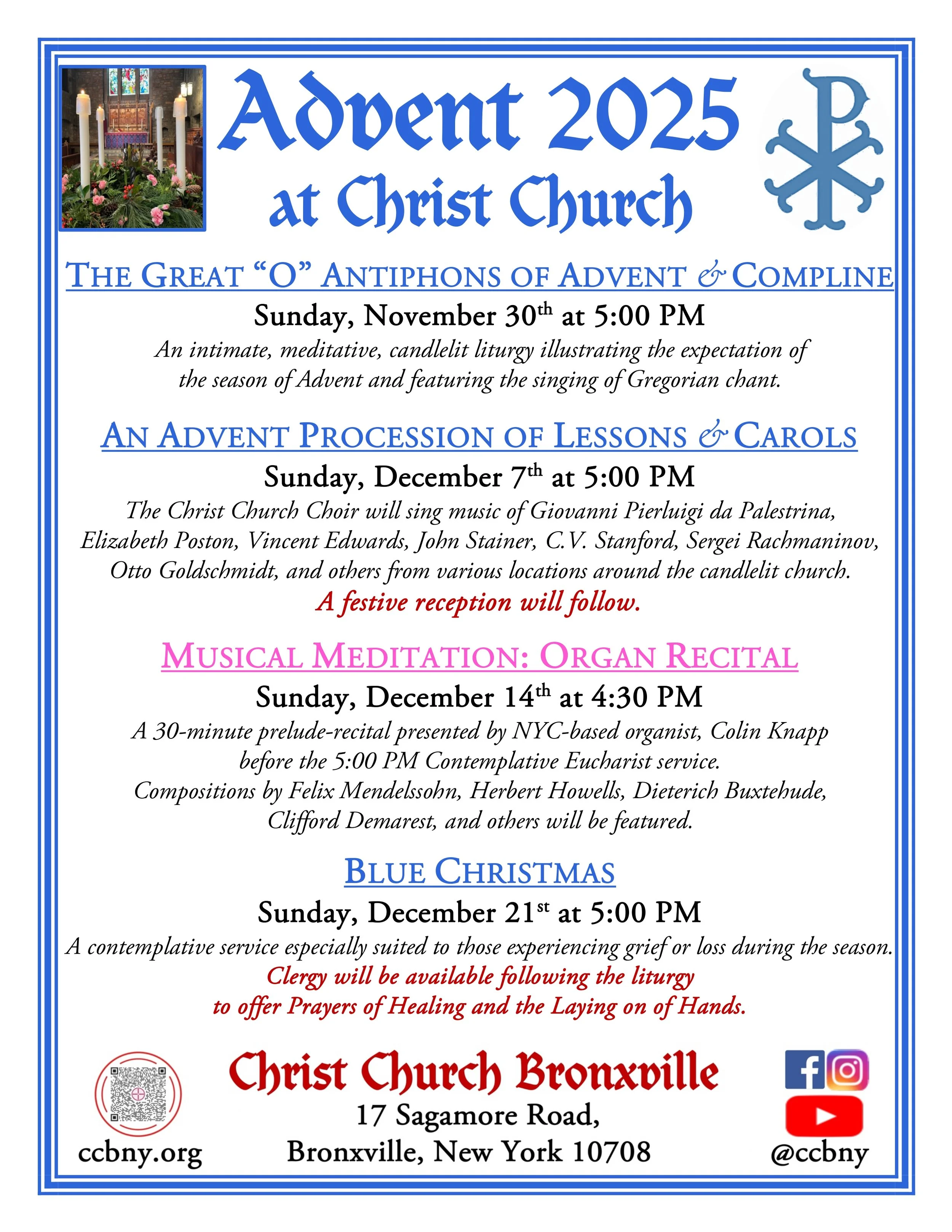 Choral Family Eucharist, 10:00am, Sunday - This Rite II (contemporary language) service is Christ Church at its most lively - characterized by extraordinary music from our choirs, active congregational singing, the presence of every generation, and the very beautiful Sarum Use as it is expressed in Bronxville.